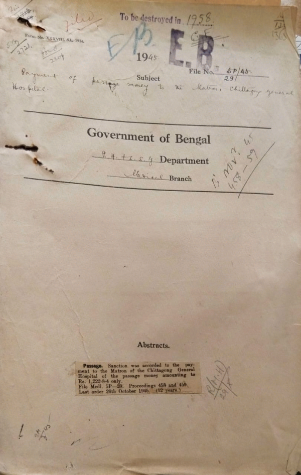 Payment of Passage money to the Matron, Chittagong General Hospital.