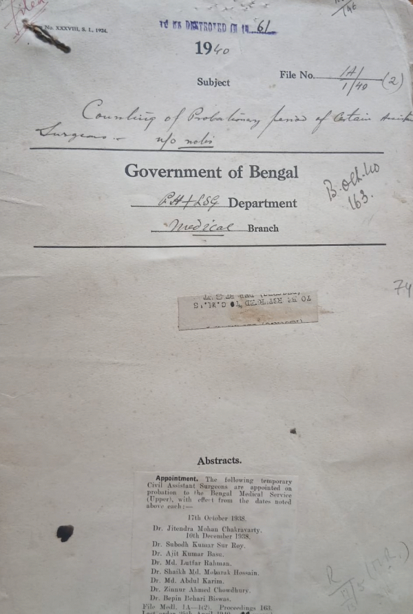| Rack No. 8, Bundle No. 77, Sl No. 5971 Enquiry from the S.G.B. regarding administrative posts, non administrative posts carrying special increased pay included in the I.M.S. | Rack No. 8, Bundle No. 77, Sl No. 5972 Payment of 5% extra charge on every bill for publications & Journals, etc published outside India & Purchased through the recognized contractors. | Rack No. 8, Bundle No. 77, Sl No. 5973 Hiring of a new building for office accommodation. | Rack No. 8, Bundle No. 77, Sl No. 5974 Counting of probationary period of certain Assistant Surgeons. | Rack No. 8, Bundle No. 77, Sl No. 5975 Eligibility of persons for appointments as Pharmaceutical Chemist. | Rack No. 8, Bundle No. 77, Sl No. 5976 Posting of Assistant Surgeon Dr. Ashit Lal to the Howrah General Hospital. | Rack No. 8, Bundle No. 77, Sl No. 5977 Appointment of Dr. Madhan Lal Chakravarty as Demonstrator of Physiology Calcutta Medical College Hospital. |