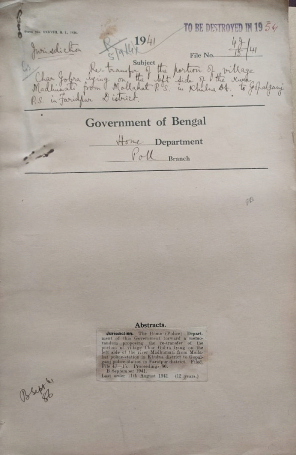 Re-transfer of the Partition of Village Char Gobra lying on the left Side of the river Madhumati from Mollahat P.S. in Khulna District to Gopalganj P.S. in Faridpur.