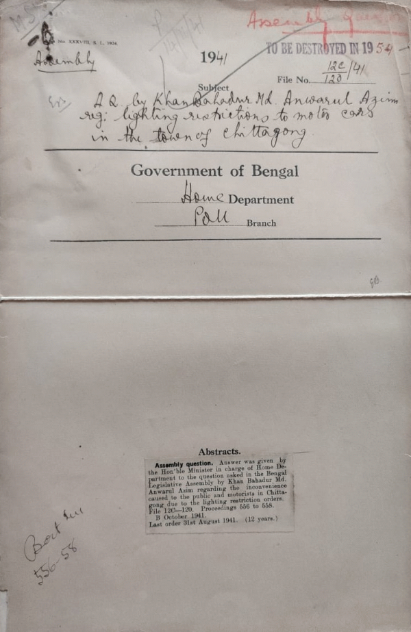 A.Q. by Khan Bahadur Md. Anwarul Azim regarding lighting restrictions to motor cars in the town of Chittagong.