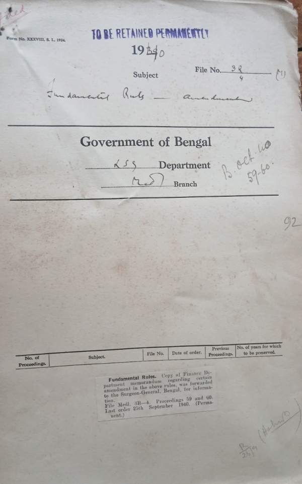 | Rack No. 8, Bundle No. 77, Sl No. 5989 Donation made by certain gentlemen in the district of Midnapore. | Rack No. 8, Bundle No. 77, Sl No. 5990 Rules relating to the recruitment of officers under the Medical department. | Rack No. 8, Bundle No. 77, Sl No. 5991 Financial delegation Orders. | Rack No. 8, Bundle No. 77, Sl No. 5992 Finance Department memorandum regarding certain amendment in the Fundamental Rules. | Rack No. 8, Bundle No. 77, Sl No. 5993 Scales of pay for officers & establishment under schemes financed by the Council. | Rack No. 8, Bundle No. 77, Sl No. 5994 Burma Government Medical School Report. | Rack No. 8, Bundle No. 77, Sl No. 5995 Extension of tenure of appointment of Dr. J.N. Aich. |