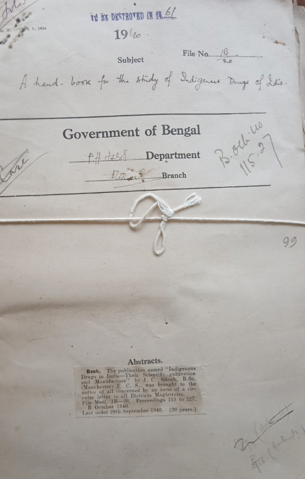 | Rack No. 8, Bundle No. 77, Sl No. 5996 Deputation of Assistant Surgeon for undergoes the D.T.M. Course. | Rack No. 8, Bundle No. 77, Sl No. 5997 Rules of Business. | Rack No. 8, Bundle No. 77, Sl No. 5998 Land Acquisition for the extension of the Jadavpur T.B. Hospital. | Rack No. 8, Bundle No. 77, Sl No. 5999 A hand Book for the study of Indigenous Drugs of India. | Rack No. 8, Bundle No. 77, Sl No. 6000 Annual Report on the Civil Hospital & Dispensaries in the Bombay Province, 1939. | Rack No. 8, Bundle No. 78, Sl No. 6001 Procedure for disbursement of grants to Local Bodies. | Rack No. 8, Bundle No. 78, Sl No. 6002 Additional grant under District Medical Establishment T.A. |