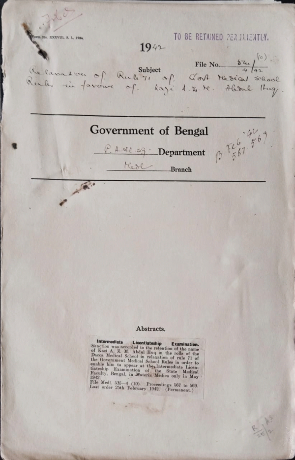 | Rack No. 9, Bundle No. 84, Sl No. 6440 Establishment of a class II dispensary at Baksa Duars. | Rack No. 9, Bundle No. 84, Sl No. 6441 Procedure for expeditious settlements of family pension Claims. | Rack No. 9, Bundle No. 84, Sl No. 6441 Relaxation of rule 71 of Got. Medical School Rules in favour of Kazi A.Z.M. Abdul Huq. | Rack No. 9, Bundle No. 84, Sl No. 6442 Payment of sales tax by Govt. Department. | Rack No. 9, Bundle No. 84, Sl No. 6443 Lien of Dr. J. Nicholas on the post of superintendent, Pasteur Institute, Calcutta. | Rack No. 9, Bundle No. 84, Sl No. 6444 Enrolment of Govt. servants in the A.R.P. of Civil Defencse Services. | Rack No. 9, Bundle No. 84, Sl No. 6446 Conveying of a medical board at Dacca for the medical exam of a sepoy for grant of Special disability leave. |