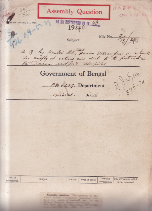 A.Q. by Md. Abdul Hakim Virkrampuri regarding Contracts for supply of food stuff etc, to the Mitford Hospital, Dacca.