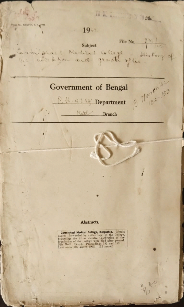 | Rack No. 9, Bundle No. 84, Sl No. 6446 Conveying of a medical board at Dacca for the medical exam of a sepoy for grant of Special disability leave. | Rack No. 9, Bundle No. 84, Sl No. 6447 Relaxation of Rule 71 of Govt. Medical School Rules in favour of Babu Birendra Kishore Das. | Rack No. 9, Bundle No. 84, Sl No. 6448 Budget estimates of the Ranchi European Mental Hospital for 1942-43. | Rack No. 9, Bundle No. 84, Sl No. 6449 Carmichael Medical College Silver Jubilee Celebration. | Rack No. 9, Bundle No. 84, Sl No. 6450 Conference of commissioners of Divisions. | Rack No. 9, Bundle No. 84, Sl No. 6451 Report of the Chaukidari Enquiry Committee. | Rack No. 9, Bundle No. 84, Sl No. 6452 Grant of Mirik dispensary Kurseong Subdivision. |