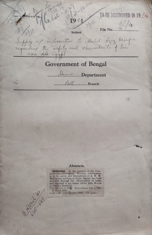 | Rack No. 42, Bundle No. 05, Sl No. 285 A.Q. by Khan Bahadur Md. Anwarul Azim regarding lighting restrictions to motor cars in the town of Chittagong. | Rack No. 42, Bundle No. 05, Sl No. 286 Inclusion of certain police station within the local limits of the jurisdiction of the courts of certain Munsifs. | Rack No. 42, Bundle No. 05, Sl No. 287 Appointment of Mvi. Md. Nurul Huq. B.A. as Probationer in the Upper Division Classical Services in the Home Department. | Rack No. 42, Bundle No. 05, Sl No. 288 Supply of information of Abdul Aziz Miajee regarding the safety and whereabouts of his Son in Egypt. | Rack No. 42, Bundle No. 05, Sl No. 289 Proposal grant of Conveyance allowances to officers whose headquarters are at Sonapur and Noakhali. | Rack No. 42, Bundle No. 05, Sl No. 290 Jurisdiction of Naria P.S. in the District of Faridpur. | Rack No. 42, Bundle No. 05, Sl No. 291 Instructions to District officers for the Control of Unlicensed Muallims and their agents. |