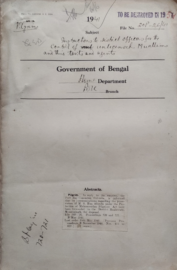 | Rack No. 42, Bundle No. 05, Sl No. 288 Supply of information of Abdul Aziz Miajee regarding the safety and whereabouts of his Son in Egypt. | Rack No. 42, Bundle No. 05, Sl No. 289 Proposal grant of Conveyance allowances to officers whose headquarters are at Sonapur and Noakhali. | Rack No. 42, Bundle No. 05, Sl No. 290 Jurisdiction of Naria P.S. in the District of Faridpur. | Rack No. 42, Bundle No. 05, Sl No. 291 Instructions to District officers for the Control of Unlicensed Muallims and their agents. | Rack No. 42, Bundle No. 05, Sl No. 292 Jurisdiction of the Godagari P.S. and the courts of Munsifs at Rajshahi. | Rack No. 42, Bundle No. 05, Sl No. 293 Extension of the memo of terms executed for the accommodation of troops at Saidpur. | Rack No. 42, Bundle No. 05, Sl No. 294 Jurisdiction of the Naria P.S. in the District of Faridpore. |