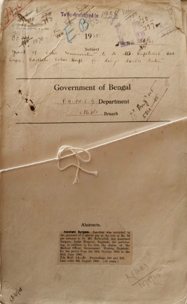Grant of extra remuneration to Dr. Refatullah, Assistant Surgeon, Rajshahi Sadar Hospital for doing double duties.