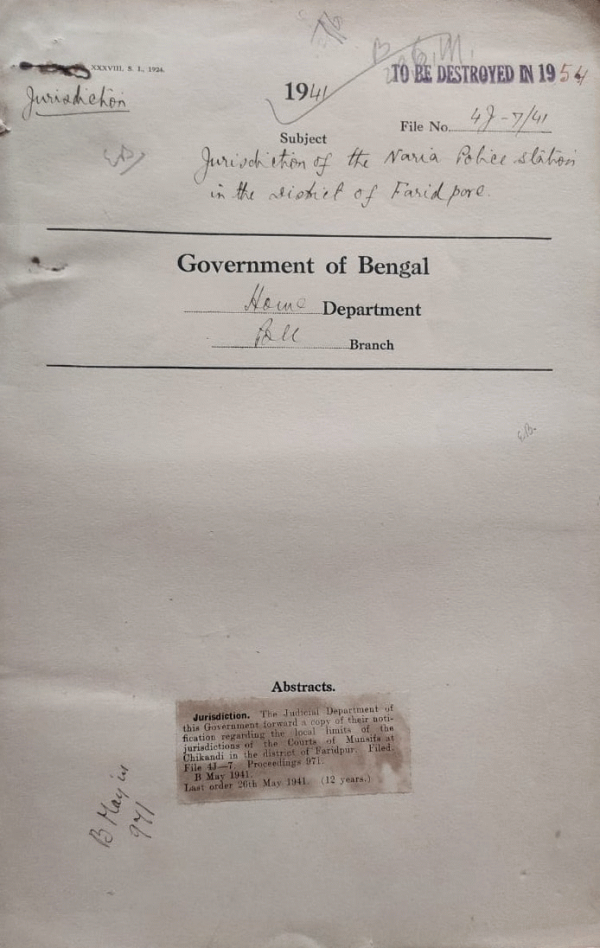 | Rack No. 42, Bundle No. 05, Sl No. 291 Instructions to District officers for the Control of Unlicensed Muallims and their agents. | Rack No. 42, Bundle No. 05, Sl No. 292 Jurisdiction of the Godagari P.S. and the courts of Munsifs at Rajshahi. | Rack No. 42, Bundle No. 05, Sl No. 293 Extension of the memo of terms executed for the accommodation of troops at Saidpur. | Rack No. 42, Bundle No. 05, Sl No. 294 Jurisdiction of the Naria P.S. in the District of Faridpore. | Rack No. 42, Bundle No. 05, Sl No. 295 Grant of arrear to Babu N.C. Dastidar for the use of his land by Military authorities in connection with the Military treatments at Dhalghat. | Rack No. 42, Bundle No. 05, Sl No. 296 Appointment of Maulvi. Wahidul Alam as Secretariat Stenographer in the Bengal Secretariat. | Rack No. 42, Bundle No. 05, Sl No. 297 Appointment of Fazlur Rahman, record supplier in place of Golam Ahmed, record Supplies Home (Police) Department resigned. |