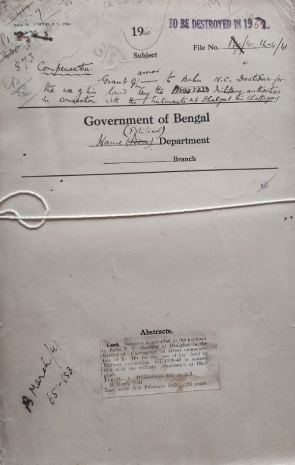 Grant of arrear to Babu N.C. Dastidar for the use of his land by Military authorities in connection with the Military treatments at Dhalghat.