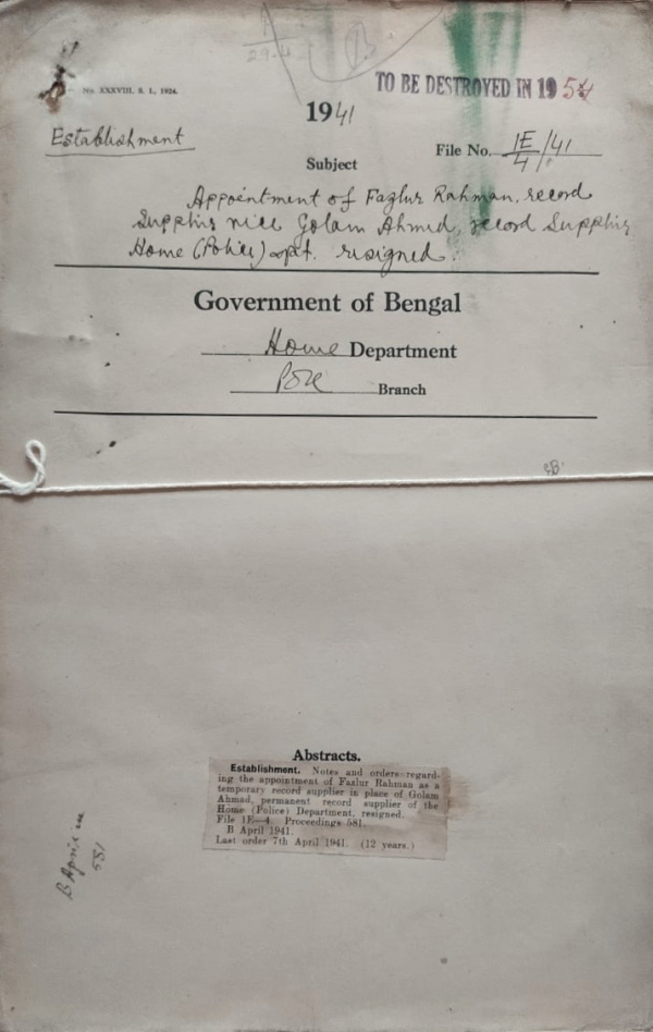 Appointment of Fazlur Rahman, record supplier in place of Golam Ahmed, record Supplies Home (Police) Department resigned.