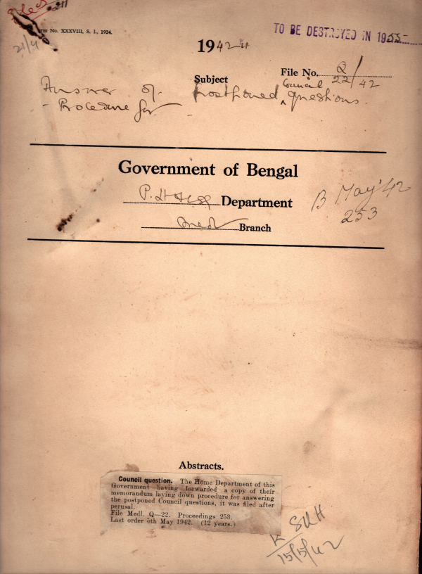 | Rack No. 09; Bundle No. 87 SL No. 6698 Resolutions in the Calcutta medical institute the action taken by the removal of the grievances of the student their filled after refusal. | Rack No. 09; Bundle No. 87 SL No. 6699 Exemption of Md. Nurul Huq a student of the Chittagong medical School from payment of school fees for two quarters. | Rack No. 09; Bundle No. 87 SL No. 6700 Detention of convict lunatic sonaullah mundy in the Indian mental hospital after the expiry of his sentence. | Rack No. 09; Bundle No. 87 SL No. 6701 Answer of postponed council questions perusal for | Rack No. 09; Bundle No. 87 SL No. 6702 T.A. of Mr. G.J. Culter for all ending the meeting mental hospital. | Rack No. 09; Bundle No. 87 SL No. 6703 Additional pay of the Civil Surgeon Bankura excusive charge of the Bonstal School. | Rack No. 09; Bundle No. 87 SL No. 6704 Bengal provincial Services recruitment rules amendments. |