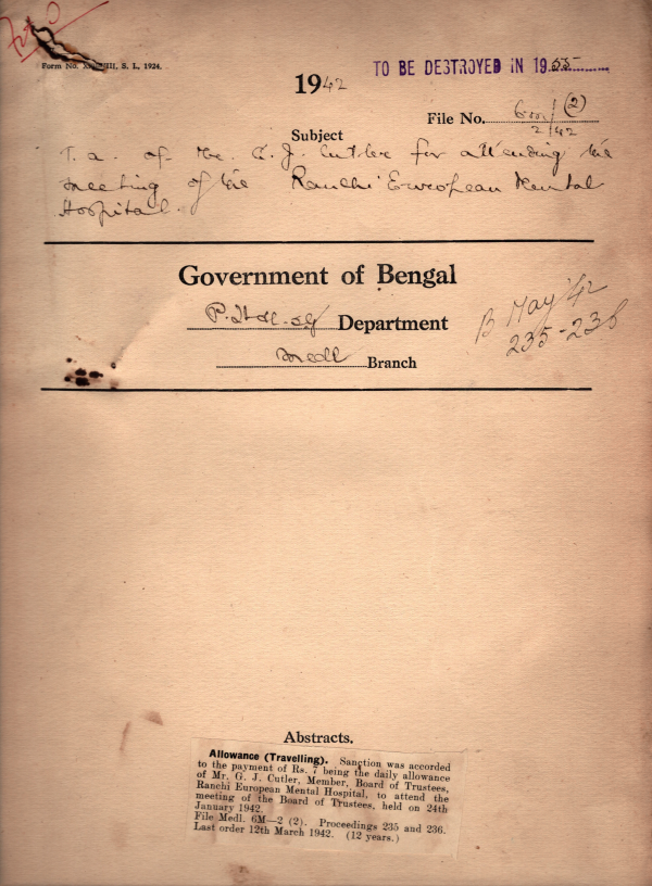 | Rack No. 09; Bundle No. 87 SL No. 6699 Exemption of Md. Nurul Huq a student of the Chittagong medical School from payment of school fees for two quarters. | Rack No. 09; Bundle No. 87 SL No. 6700 Detention of convict lunatic sonaullah mundy in the Indian mental hospital after the expiry of his sentence. | Rack No. 09; Bundle No. 87 SL No. 6701 Answer of postponed council questions perusal for | Rack No. 09; Bundle No. 87 SL No. 6702 T.A. of Mr. G.J. Culter for all ending the meeting mental hospital. | Rack No. 09; Bundle No. 87 SL No. 6703 Additional pay of the Civil Surgeon Bankura excusive charge of the Bonstal School. | Rack No. 09; Bundle No. 87 SL No. 6704 Bengal provincial Services recruitment rules amendments. | Rack No. 09; Bundle No. 87 SL No. 6705 Examination to Babu Biswa Rangan Das an evacuee Medical student from Burma in the final L.E. |