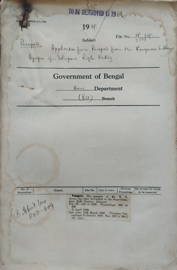 Application for a passport from Mr. K.S. Ayapa of Ishapore Rifle Factory.