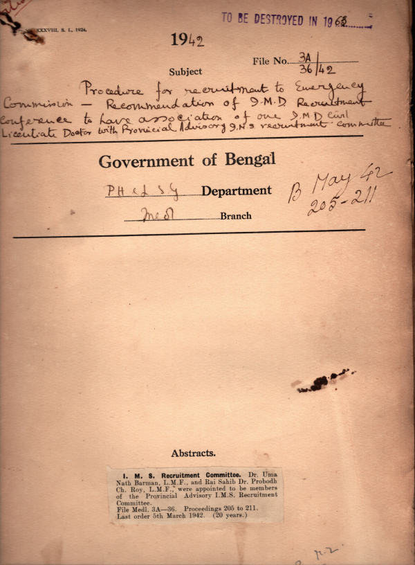| Rack No. 09; Bundle No. 87 SL No. 6708 Pay of Dr. Heramba Chandra Maitha while acting as civil srugeon Darjeeling. | Rack No. 09; Bundle No. 87 SL No. 6709 Payment of maintain charge of a mental patient S.K. Yasin. | Rack No. 09; Bundle No. 87 SL No. 6710 Leave of Dr. Ranundu Mazumdar Surgical register medical college hospital | Rack No. 09; Bundle No. 87 SL No. 6711 Procedure for recruitment to emergency commission in the Indian medical service Dr. Uma Nath Barman of the Provincial advisory I.M.S. recruitment committee. | Rack No. 09; Bundle No. 87 SL No. 6712 Proceedings of the conference of commissioner held of Congealing in October 1941. | Rack No. 09; Bundle No. 87 SL No. 6713 Grichton Trust Fund | Rack No. 09; Bundle No. 87 SL No. 6714 Re-employment of retired officers to posts created by provincial Govt. under their own powers. |