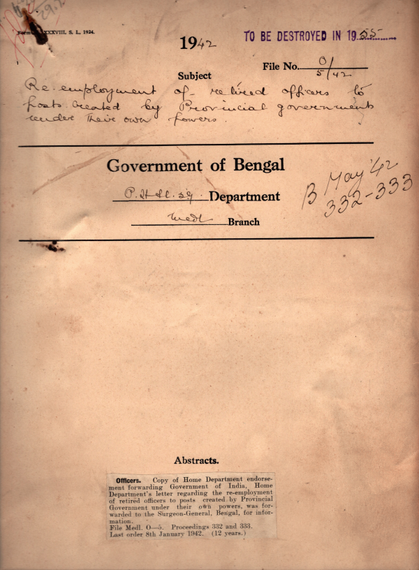 | Rack No. 09; Bundle No. 87 SL No. 6711 Procedure for recruitment to emergency commission in the Indian medical service Dr. Uma Nath Barman of the Provincial advisory I.M.S. recruitment committee. | Rack No. 09; Bundle No. 87 SL No. 6712 Proceedings of the conference of commissioner held of Congealing in October 1941. | Rack No. 09; Bundle No. 87 SL No. 6713 Grichton Trust Fund | Rack No. 09; Bundle No. 87 SL No. 6714 Re-employment of retired officers to posts created by provincial Govt. under their own powers. | Rack No. 09; Bundle No. 87 SL No. 6715 A.Q. by Khan Bahadur Md. Solaiman regarding improvement in the number of Mrs. Lim Assis. Research workers and Assistant Professor in the School of Tropical Medicine. | Rack No. 09; Bundle No. 87 SL No. 6716 Massage of Sin Staff and Cripps to his Excellency the viceroy and the reply | Rack No. 09; Bundle No. 87 SL No. 6717 Triennial report on the working of the Civil hospital and dispensaries in Assam for the years 1938-40. |