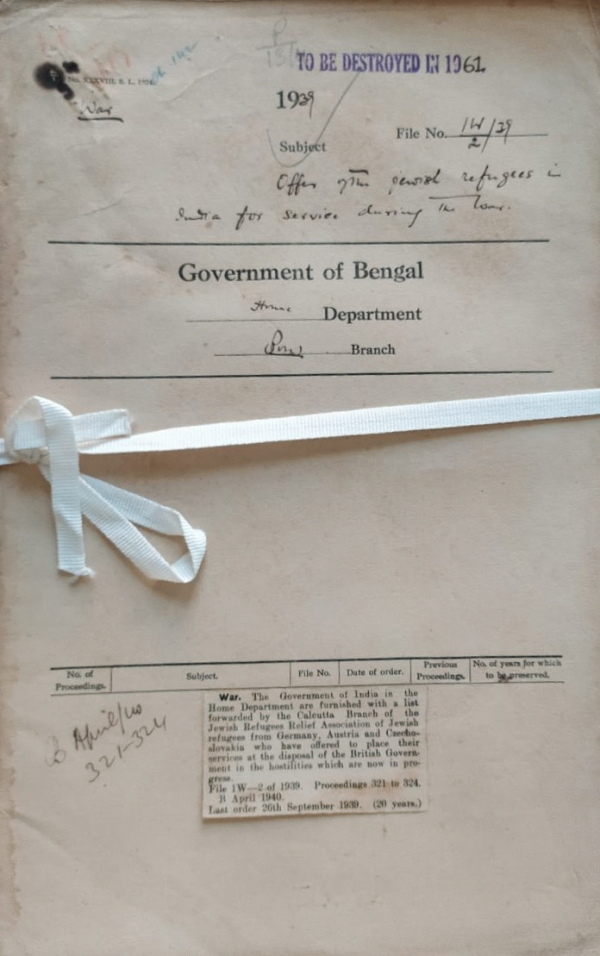 Offer of their services to Govt. by the Jewish Refugees Relief Association, Calcutta Branch in India.