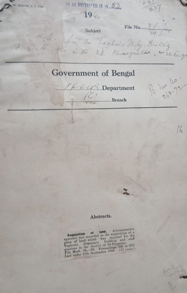 | Rack No. 8, Bundle No. 78, Sl No. 6013 Crossing of the efficiency bar by Dr. Satya Ranjan Das Gupta and Dr. Ramesh Ch. Chakravaerty. | Rack No. 8, Bundle No. 78, Sl No. 6014 Report of Cases in which posts reserved for I.M.S. Officers are filled u/s by non I.M.S. officers. Extract from notes in Home (Jail) for 1939-40. | Rack No. 8, Bundle No. 78, Sl No. 6015 L.A. for the Dist. Board of 24-Parganas for a dispensary in the village of Joypur Gopemahal. | Rack No. 8, Bundle No. 78, Sl No. 6016 L.A. for the Teghoria dispensary buildings and staff quarters in the village of Muragachha. | Rack No. 8, Bundle No. 78, Sl No. 6017 Recruitment of additional staff for S.G's officer as a war measure. | Rack No. 8, Bundle No. 78, Sl No. 6018 Statements showing the particular of stores purchased in India by the officers of the Medical Department during 1939-40. | Rack No. 8, Bundle No. 78, Sl No. 6019 Instruction regarding payment of bills in favour of enemy firms. |