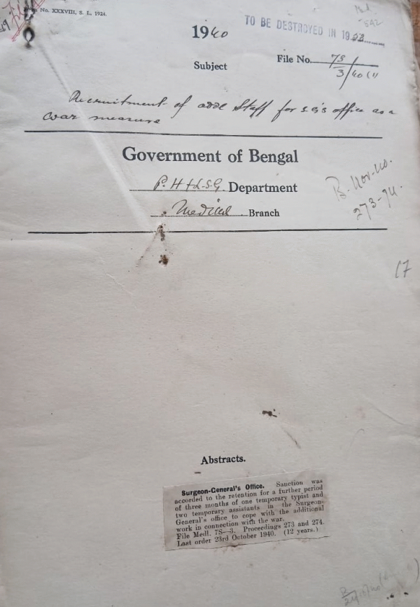 | Rack No. 8, Bundle No. 78, Sl No. 6014 Report of Cases in which posts reserved for I.M.S. Officers are filled u/s by non I.M.S. officers. Extract from notes in Home (Jail) for 1939-40. | Rack No. 8, Bundle No. 78, Sl No. 6015 L.A. for the Dist. Board of 24-Parganas for a dispensary in the village of Joypur Gopemahal. | Rack No. 8, Bundle No. 78, Sl No. 6016 L.A. for the Teghoria dispensary buildings and staff quarters in the village of Muragachha. | Rack No. 8, Bundle No. 78, Sl No. 6017 Recruitment of additional staff for S.G's officer as a war measure. | Rack No. 8, Bundle No. 78, Sl No. 6018 Statements showing the particular of stores purchased in India by the officers of the Medical Department during 1939-40. | Rack No. 8, Bundle No. 78, Sl No. 6019 Instruction regarding payment of bills in favour of enemy firms. | Rack No. 8, Bundle No. 78, Sl No. 6020 D.P.H. of the Calcutta University. |