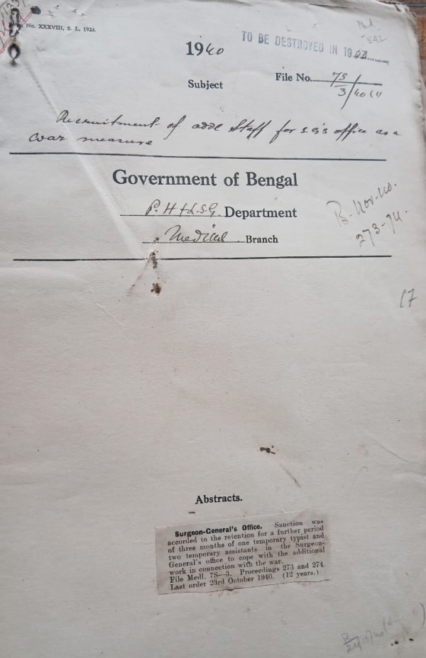 | Rack No. 8, Bundle No. 78, Sl No. 6015 L.A. for the Dist. Board of 24-Parganas for a dispensary in the village of Joypur Gopemahal. | Rack No. 8, Bundle No. 78, Sl No. 6016 L.A. for the Teghoria dispensary buildings and staff quarters in the village of Muragachha. | Rack No. 8, Bundle No. 78, Sl No. 6017 Recruitment of additional staff for S.G's officer as a war measure. | Rack No. 8, Bundle No. 78, Sl No. 6018 Statements showing the particular of stores purchased in India by the officers of the Medical Department during 1939-40. | Rack No. 8, Bundle No. 78, Sl No. 6019 Instruction regarding payment of bills in favour of enemy firms. | Rack No. 8, Bundle No. 78, Sl No. 6020 D.P.H. of the Calcutta University. | Rack No. 8, Bundle No. 78, Sl No. 6021 Estimate for constructing racks in the Civil Court room at Maijdi. |