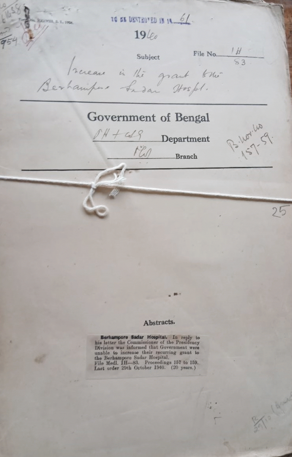 | Rack No. 8, Bundle No. 78, Sl No. 6022 Extension of tenure of appointment of Dr. U.P. Basu, Honorary visiting physician Medical College Hospital. | Rack No. 8, Bundle No. 78, Sl No. 6023 Recruitment in B.M.S. (Upper), Case of M. Islam. | Rack No. 8, Bundle No. 78, Sl No. 6024 L.A. by the Calcutta Medical Institute for extension of the School. | Rack No. 8, Bundle No. 78, Sl No. 6025 Increase of the grant to the Berhampore Sadar Hospital. | Rack No. 8, Bundle No. 78, Sl No. 6026 L.A. for the extension of the Faridpur Sadar Charitable Hospital and Dispensary. | Rack No. 8, Bundle No. 78, Sl No. 6027 Extension of tenure of appointment of Dr. Tarapada Basu, Honorary Surgeon, Mitford Hospital, Dacca. | Rack No. 8, Bundle No. 78, Sl No. 6028 Purchase of a mortuary Collar and an epidiascope for the Dacca Medical School. |