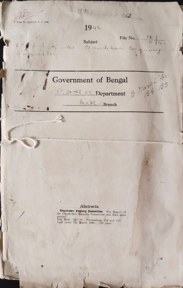 | Rack No. 9, Bundle No. 84, Sl No. 6448 Budget estimates of the Ranchi European Mental Hospital for 1942-43. | Rack No. 9, Bundle No. 84, Sl No. 6449 Carmichael Medical College Silver Jubilee Celebration. | Rack No. 9, Bundle No. 84, Sl No. 6450 Conference of commissioners of Divisions. | Rack No. 9, Bundle No. 84, Sl No. 6451 Report of the Chaukidari Enquiry Committee. | Rack No. 9, Bundle No. 84, Sl No. 6452 Grant of Mirik dispensary Kurseong Subdivision. | Rack No. 9, Bundle No. 84, Sl No. 6453 Statement of cases in which posts reserved for the I.M.S. officers were filed by the non I.M.S. officers. | Rack No. 9, Bundle No. 84, Sl No. 6454 A.Q. by Maulvi Md. Abdul Hakim Vikrampuri regarding system of allowing one doctor the benefit of Hospital service in more than one Govt. hospital. |