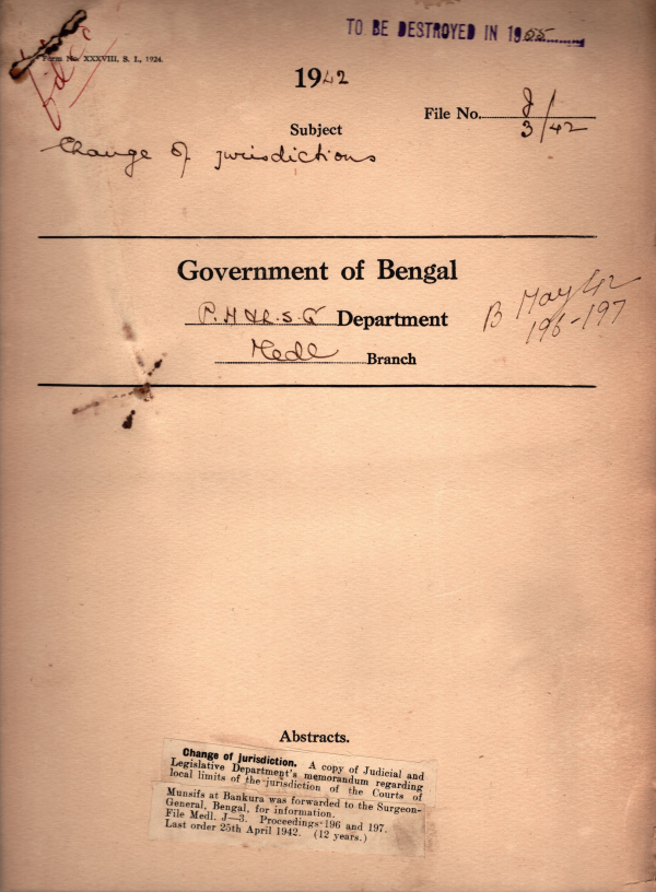 | Rack No. 09; Bundle No. 87 SL No. 6733 Deputation of Sub-Assistant Surgeon to military duty. | Rack No. 09; Bundle No. 87 SL No. 6734 Allowance of Dr. A.K. Datta Gupta for acting as civil surgeon Jalpaiguri. | Rack No. 09; Bundle No. 87 SL No. 6735 L.A. pay the Indian Iron and steel company limited for the purpose of the construction of an Isolation hospital at Patana Burdwan. | Rack No. 09; Bundle No. 87 SL No. 6736 Change of Jurisdiction | Rack No. 09; Bundle No. 87 SL No. 6737 L.A. for the municipal Small Pox ward at Perojpur. | Rack No. 09; Bundle No. 87 SL No. 6738 Payment to the Confect for the Supply of fish to the P.G. General Hospital | Rack No. 09; Bundle No. 87 SL No. 6739 Budget estimate of the Albert victor hospital for 1941-42 and 1942-43. |