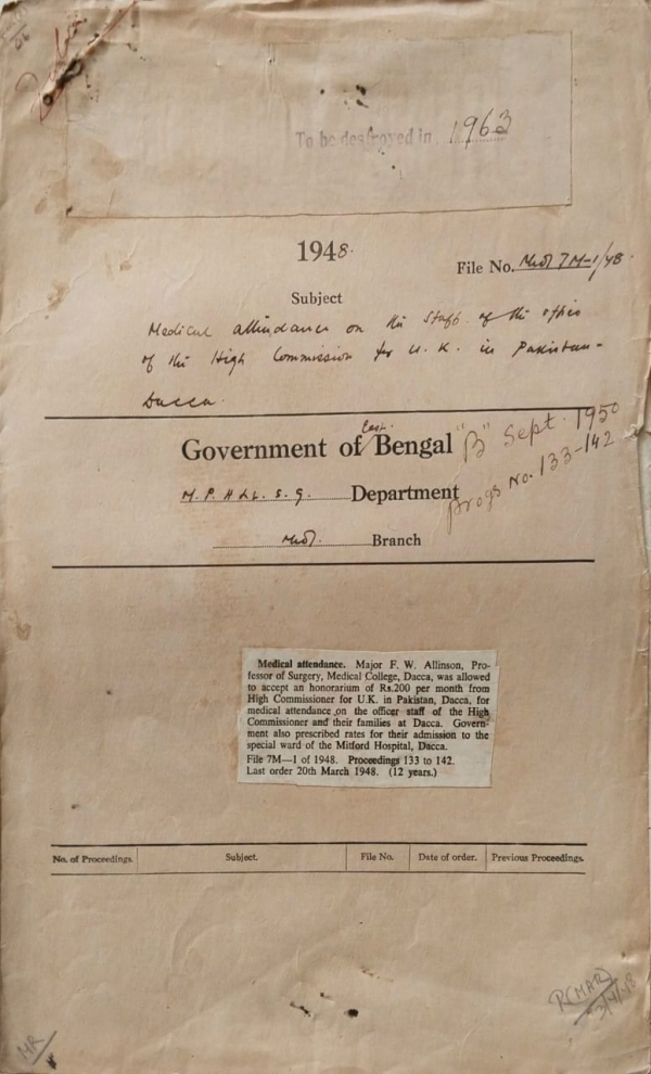 Medical attendance on the staff of the office of the High Commissioner for U.K. in Pakistan, Dacca.