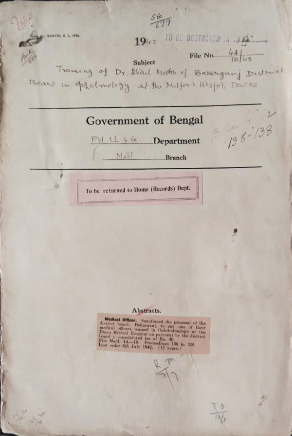 Training of Dr. Abdul Motaleb of Bakarganj District Board in Ophthalmology at the Mitford Hospital, Dacca.