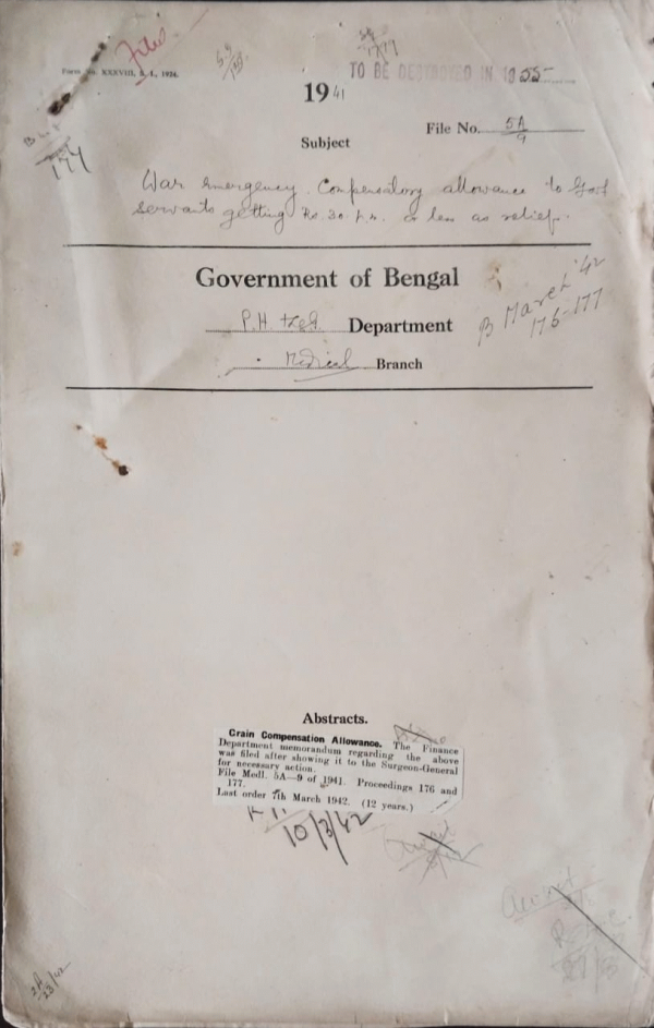 | Rack No. 9, Bundle No. 84, Sl No. 6470 Additional remuneration to Dr. Bhupendra Nath Mukherjee, Department of Pathology Medical College Calcutta for doing the duties of Assistant Prof. of Pathology in addition to his own. | Rack No. 9, Bundle No. 84, Sl No. 6471 Selection of assistants for training in the use of First Aid out fits. | Rack No. 9, Bundle No. 84, Sl No. 6472 Appointment of Dr. Md. Ibrahim as emergency Medical officer, M.C.H. Calcutta and Consequent arrangement. | Rack No. 9, Bundle No. 84, Sl No. 6473 War emergency compensationary allowance to Govt. Servants getting Rs. 30 or less as relief. | Rack No. 9, Bundle No. 84, Sl No. 6474 Additional grant to Medical College Hospitals under head "Contract Contingencies". | Rack No. 9, Bundle No. 84, Sl No. 6475 Additional grant under head "Medical and Surgical Requisites of S.N.P. Hospital". | Rack No. 9, Bundle No. 84, Sl No. 6476 Transfer to and reversion from Civil employment of Certain I.M.S. officers. |