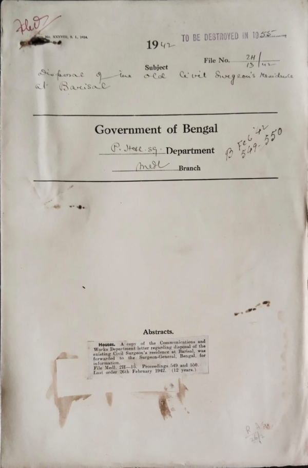 | Rack No. 9, Bundle No. 84, Sl No. 6475 Additional grant under head "Medical and Surgical Requisites of S.N.P. Hospital". | Rack No. 9, Bundle No. 84, Sl No. 6476 Transfer to and reversion from Civil employment of Certain I.M.S. officers. | Rack No. 9, Bundle No. 84, Sl No. 6477 Complaint about absence of mental hospital in Bengal Advisability of having one. | Rack No. 9, Bundle No. 84, Sl No. 6478 Disposal of the old Civil Surgeon's residence at Barisal. | Rack No. 9, Bundle No. 84, Sl No. 6479 Posting of Dr. Amulya Mohan Sen of I.M. Mazumdar. | Rack No. 9, Bundle No. 84, Sl No. 6480 Trade Payment to Creditors in enemy territories. | Rack No. 9, Bundle No. 84, Sl No. 6481 Audit of the Accounts of the Narenda Narian Dutta Trust Fund for 1938-39. |