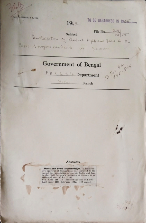 Installation of Electric lights and fans in the Civil Surgeons residence at Jessore.
