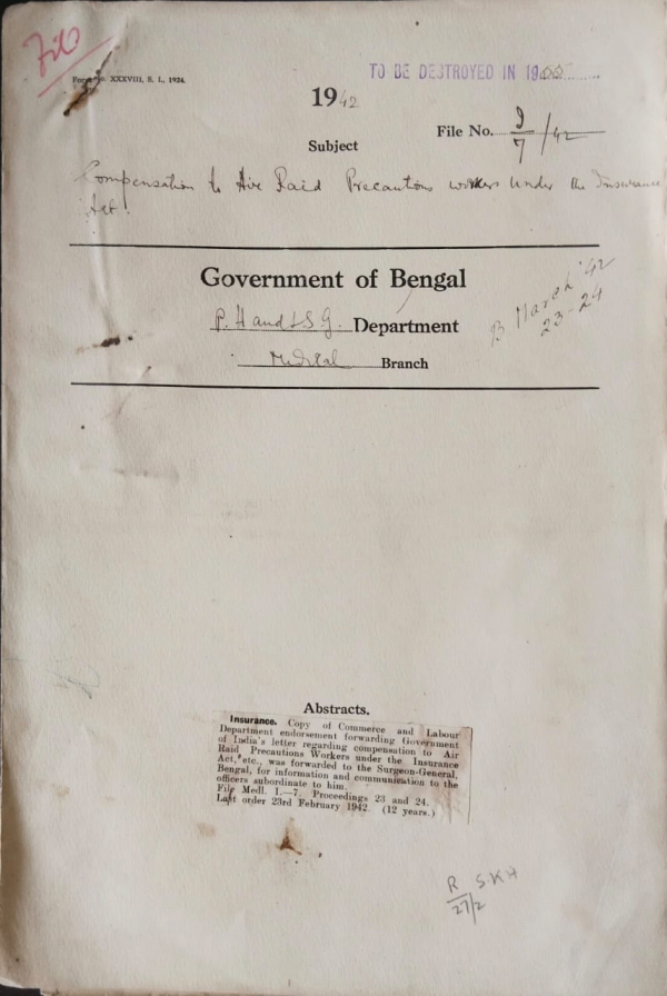 | Rack No. 9, Bundle No. 84, Sl No. 6486 Medical treatment of security prisoner Babu Nani Gopal Sen. | Rack No. 9, Bundle No. 84, Sl No. 6487 Exemption of Maulvi Md. Abul Kasem from Liability to Serve as a juror in the High Court. | Rack No. 9, Bundle No. 84, Sl No. 6488 Exemption of Pabna Dt. Board from payment of the sale tax on the medicines required for Charitable purposes. | Rack No. 9, Bundle No. 84, Sl No. 6489 Compensation to Air Raid Precautions workers under the Insurance Act. | Rack No. 9, Bundle No. 84, Sl No. 6490 Enrolment of Govt. Servants in A.R.P. or Civil Defense Services. | Rack No. 9, Bundle No. 84, Sl No. 6491 Additional remuneration to Dr. Jitendra Mohan Chakravarty, Clinical Pathologist, M.C.H. for doing double duties. | Rack No. 9, Bundle No. 84, Sl No. 6492 T.A. bill of Mr. Jagat Chandra Mandal M.L.A. for attending the meeting of Indian Mental Hospital, Ranchi. |