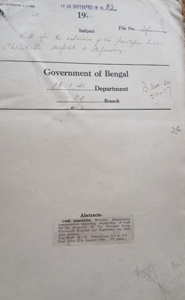 | Rack No. 8, Bundle No. 78, Sl No. 6023 Recruitment in B.M.S. (Upper), Case of M. Islam. | Rack No. 8, Bundle No. 78, Sl No. 6024 L.A. by the Calcutta Medical Institute for extension of the School. | Rack No. 8, Bundle No. 78, Sl No. 6025 Increase of the grant to the Berhampore Sadar Hospital. | Rack No. 8, Bundle No. 78, Sl No. 6026 L.A. for the extension of the Faridpur Sadar Charitable Hospital and Dispensary. | Rack No. 8, Bundle No. 78, Sl No. 6027 Extension of tenure of appointment of Dr. Tarapada Basu, Honorary Surgeon, Mitford Hospital, Dacca. | Rack No. 8, Bundle No. 78, Sl No. 6028 Purchase of a mortuary Collar and an epidiascope for the Dacca Medical School. | Rack No. 8, Bundle No. 78, Sl No. 6029 Diet Scale in state Hospital. |