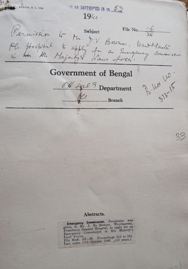 | Rack No. 8, Bundle No. 78, Sl No. 6030 Purchase of Type Writers. | Rack No. 8, Bundle No. 78, Sl No. 6031 Memorial of Babu Narendra Kumar Chanda, Store Clerk, Mitford Hospital, Dacca. | Rack No. 8, Bundle No. 78, Sl No. 6032 Exclusion from Govt. Service permission to Mr. J.V. Bowner. | Rack No. 8, Bundle No. 78, Sl No. 6033 Permission to Mr. J.V. Bowner, wardmaster P.G. Hospital to apply for an emergency commission in His Majesty's Land Forces. | Rack No. 8, Bundle No. 78, Sl No. 6034 Employment of two night watch men to patrol the whole compound of the Medical College, Calcutta, during the night hours. | Rack No. 8, Bundle No. 78, Sl No. 6035 Preparation of the revised and budget estimates. | Rack No. 8, Bundle No. 78, Sl No. 6036 Grant to the Vivekananda Medical Education society of India. |
