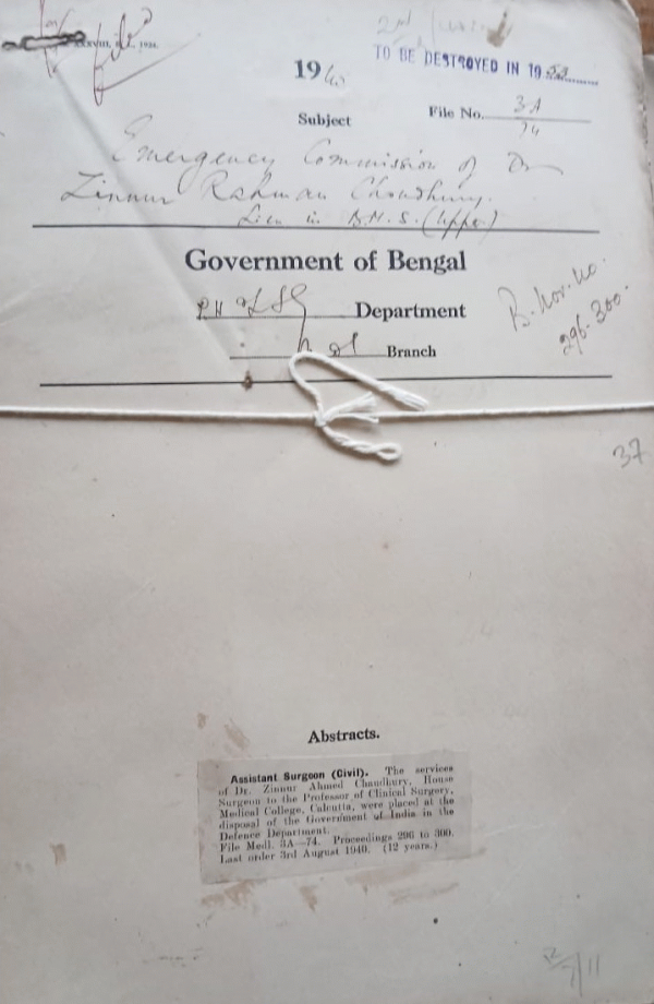 | Rack No. 8, Bundle No. 78, Sl No. 6034 Employment of two night watch men to patrol the whole compound of the Medical College, Calcutta, during the night hours. | Rack No. 8, Bundle No. 78, Sl No. 6035 Preparation of the revised and budget estimates. | Rack No. 8, Bundle No. 78, Sl No. 6036 Grant to the Vivekananda Medical Education society of India. | Rack No. 8, Bundle No. 78, Sl No. 6037 Emergency Commission of Dr. Zinnur Rahman Chowdhury. | Rack No. 8, Bundle No. 78, Sl No. 6038 Terms of Service of Civil Govt. Servants who are granted emergency commissions in His Majesty's Land Forces and His Majesty's Indian Land Forces. | Rack No. 8, Bundle No. 78, Sl No. 6039 A.Q. by Mr. Patiram Roy regarding maintenance of communal Proportion in the Post of Civil Surgeons and in the Superior Post in Medical Departments. | Rack No. 8, Bundle No. 78, Sl No. 6040 L.A. by the Howrah Dist. Board for improvement of the Mahiary Charitable Dispensary. |