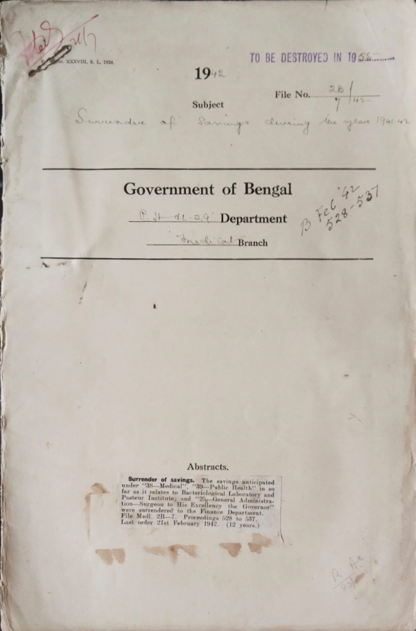 | Rack No. 9, Bundle No. 84, Sl No. 6493 Additional pay of the Head Clerk, Civil Surgeon Office, Pabna who has been working as a Meteorological observer. | Rack No. 9, Bundle No. 84, Sl No. 6494 Case of the Criminal Lunatic Bijan Bihari Hazra. | Rack No. 9, Bundle No. 84, Sl No. 6495 Case of Criminal lunatic Khadem SK. | Rack No. 9, Bundle No. 84, Sl No. 6496 Surrender of savings during the year 1941-42. | Rack No. 9, Bundle No. 84, Sl No. 6497 Case of Criminal lunatic Narandra Nath Das. | Rack No. 9, Bundle No. 84, Sl No. 6498 I.M.S. (Civil) officers Question of Confirmation. | Rack No. 9, Bundle No. 84, Sl No. 6499 Opening of a separate Quinine Sale Department at Calcutta. |