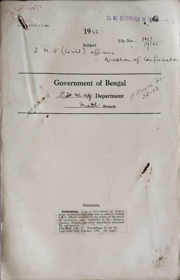 | Rack No. 9, Bundle No. 84, Sl No. 6495 Case of Criminal lunatic Khadem SK. | Rack No. 9, Bundle No. 84, Sl No. 6496 Surrender of savings during the year 1941-42. | Rack No. 9, Bundle No. 84, Sl No. 6497 Case of Criminal lunatic Narandra Nath Das. | Rack No. 9, Bundle No. 84, Sl No. 6498 I.M.S. (Civil) officers Question of Confirmation. | Rack No. 9, Bundle No. 84, Sl No. 6499 Opening of a separate Quinine Sale Department at Calcutta. | Rack No. 9, Bundle No. 84, Sl No. 6500 Working pay to prisoners of War Incidence of. | Rack No. 9, Bundle No. 85, Sl No. 6501 Grant to the Calcutta Medical School. |