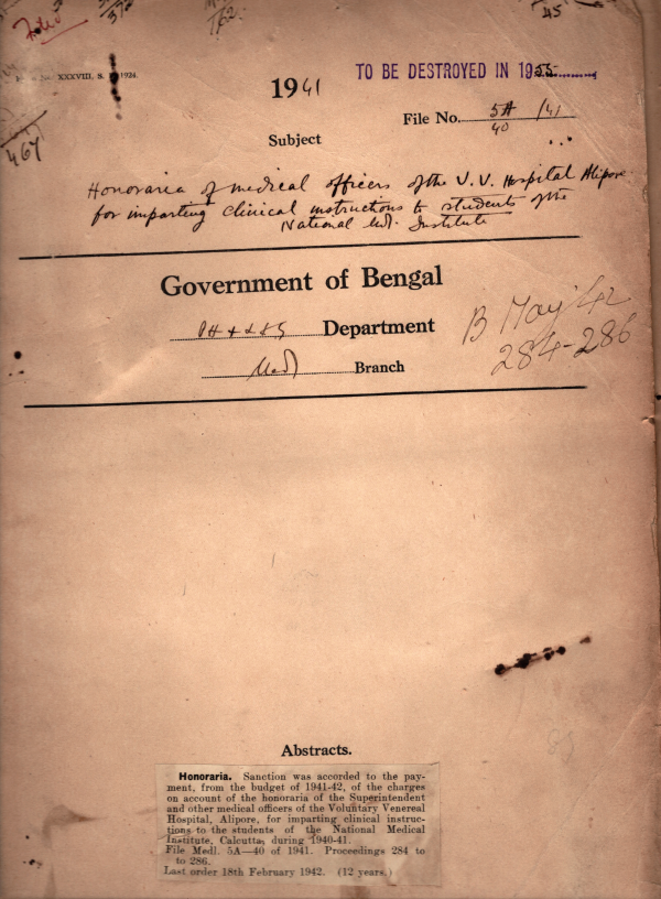| Rack No. 09; Bundle No. 87 SL No. 6760 Relaxation of rules 3 of S.M.F regulation of miss Jaylakshmi Rao. | Rack No. 09; Bundle No. 88 SL No. 6761 Temporary increase in the Scale of X-ray fees in P.G. Hospital, Calcutta. | Rack No. 09; Bundle No. 88 SL No. 6762 Appointment of Certain Medical Officers to the Civil Branch of the I.M.S. | Rack No. 09; Bundle No. 88 SL No. 6763 Honoraria of M/O. of the V.V. Hospital, Alipore. | Rack No. 09; Bundle No. 88 SL No. 6764 Fare Cast of stores to be Purchased from England during 1942-43. | Rack No. 09; Bundle No. 88 SL No. 6765 Transmission to the Central govt. one copy of the prescribed form for registration Ordinance 1939. | Rack No. 09; Bundle No. 88 SL No. 6766 Reciprocal registration of nurses an midwives between the Bengal Nursing Council. |