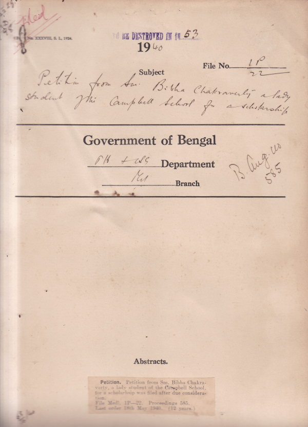 Petition from Sm. Bibha Chakavarty a lady studnet of the Campbell School for a Scholarship.
