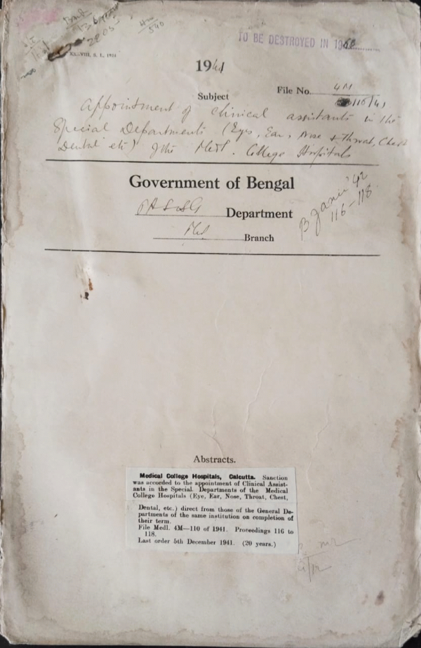| Rack No. 9, Bundle No. 85, Sl No. 6505 L.A. by the Medical Education Society for the extension of the Carmichael Medical College Hospital. | Rack No. 9, Bundle No. 85, Sl No. 6506 T.A. of Mr. A. Hakim for attending at the Ranchi Indian Mental Hospital. | Rack No. 9, Bundle No. 85, Sl No. 6507 Duars allowance abolition of compensatory allowance for expensiveness of living. | Rack No. 9, Bundle No. 85, Sl No. 6508 Appointment of Clinical Assistant in the Special Departments of the Medical College Hospital. | Rack No. 9, Bundle No. 85, Sl No. 6509 Determination of the age of Mr. Haridas Ganguli, Assistant Chemical Examiner to the govt. of Bengal. | Rack No. 9, Bundle No. 85, Sl No. 6510 Grant of the Prince Golam Md. Charitable Dispensaries. | Rack No. 9, Bundle No. 85, Sl No. 6511 Grant to the National Infirmary, Maniktala. |