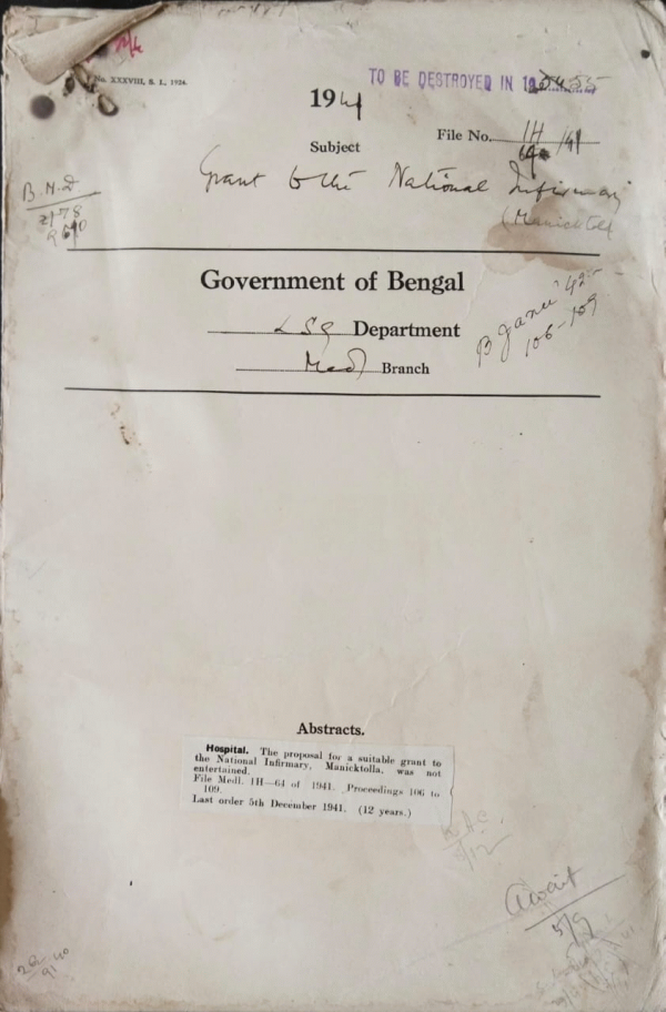 | Rack No. 9, Bundle No. 85, Sl No. 6508 Appointment of Clinical Assistant in the Special Departments of the Medical College Hospital. | Rack No. 9, Bundle No. 85, Sl No. 6509 Determination of the age of Mr. Haridas Ganguli, Assistant Chemical Examiner to the govt. of Bengal. | Rack No. 9, Bundle No. 85, Sl No. 6510 Grant of the Prince Golam Md. Charitable Dispensaries. | Rack No. 9, Bundle No. 85, Sl No. 6511 Grant to the National Infirmary, Maniktala. | Rack No. 9, Bundle No. 85, Sl No. 6512 Discontinuance of the allowance of Rs. 50 per menses to the Roman Catholic Chaplain for religions ministration to the patients at the P.G. Hospital, Calcutta. | Rack No. 9, Bundle No. 85, Sl No. 6513 A.Q. by Mr. Taraknath Mukherji regarding number the Hospitals and dispensaries in the Province of Bengal. | Rack No. 9, Bundle No. 85, Sl No. 6514 Lien of Dr. Hayter, I.M.D. reverted to Military Service to the Post of Assistant Director, School of Tropical Medicine, and Calcutta. |