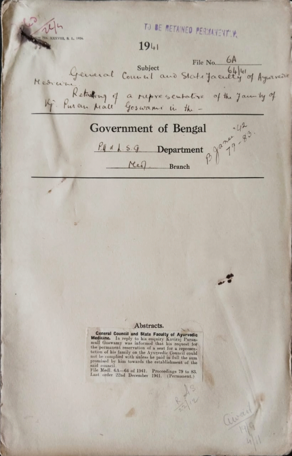 | Rack No. 9, Bundle No. 85, Sl No. 6517 Grant of an honorarium to the Senior House Surgeons of the venereal Department of the Medical College Hospital, Calcutta. | Rack No. 9, Bundle No. 85, Sl No. 6518 Supply and Conservation of old X-ray films. | Rack No. 9, Bundle No. 85, Sl No. 6519 Care of Criminal lunatic panmoni were filed after perusal. | Rack No. 9, Bundle No. 85, Sl No. 6520 General council and state faculty of Ayurvedic Medicine. | Rack No. 9, Bundle No. 85, Sl No. 6521 Bengal profession Trades Callings, Employment Taxation Rules. | Rack No. 9, Bundle No. 85, Sl No. 6522 Verification rolls of Nepalese. | Rack No. 9, Bundle No. 85, Sl No. 6523 Charges on account of advertisements for recruitment of Medical Personnel in connection with the war should be from by provincial govt. |