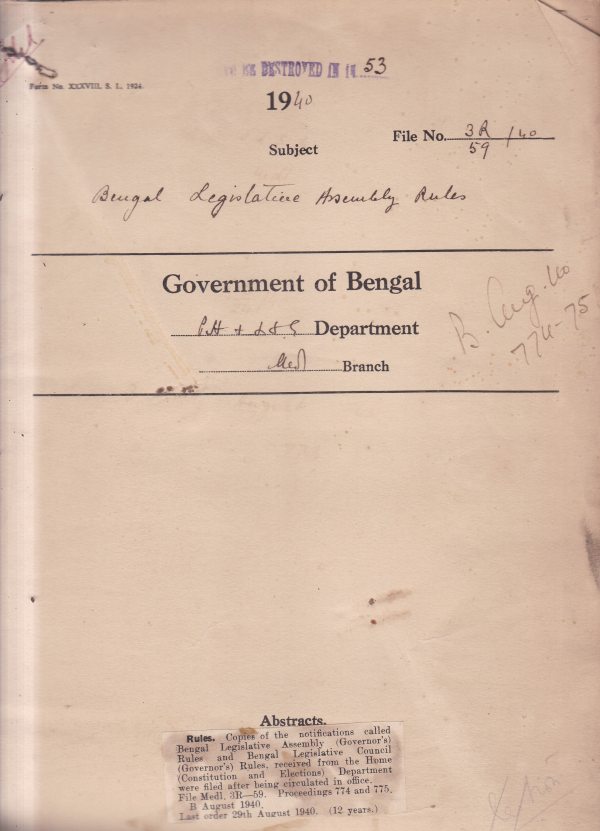 | Rack no. 08, Bundle no. 74, Sl no. 5670 Relaxation of S.M.F. Regulation in favour of Babu Bhupendra Lal Datta. | Rack no. 08, Bundle no. 74, Sl no. 5671 L.A. by Narayanganj Municipality for extension of the Victoria Hospital at Narayanganj. | Rack no. 08, Bundle no. 74, Sl no. 5672 A.Q. by Dr. Nalinaksha Sanyal regarding admission of students into the Medical College, Calcutta. | Rack no. 08, Bundle no. 74, Sl no. 5673 Bengal Legislative Assembly Rules. | Rack no. 08, Bundle no. 74, Sl no. 5674 G.P. Fund (Central Services) Rules, Amendment. | Rack no. 08, Bundle no. 74, Sl no. 5675 Creation of Jyotirmoyee Das Endowment Trust. | Rack no. 08, Bundle no. 74, Sl no. 5676 Appointment of a B.M.S. teacher of the Mymensingh Medical School, as Medical Officer of the District Jail. |