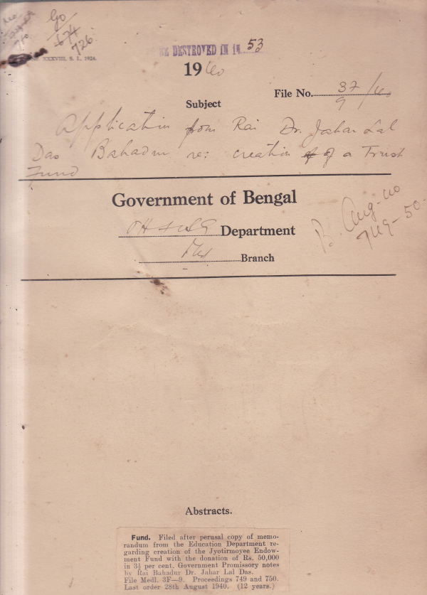 | Rack no. 08, Bundle no. 74, Sl no. 5672 A.Q. by Dr. Nalinaksha Sanyal regarding admission of students into the Medical College, Calcutta. | Rack no. 08, Bundle no. 74, Sl no. 5673 Bengal Legislative Assembly Rules. | Rack no. 08, Bundle no. 74, Sl no. 5674 G.P. Fund (Central Services) Rules, Amendment. | Rack no. 08, Bundle no. 74, Sl no. 5675 Creation of Jyotirmoyee Das Endowment Trust. | Rack no. 08, Bundle no. 74, Sl no. 5676 Appointment of a B.M.S. teacher of the Mymensingh Medical School, as Medical Officer of the District Jail. | Rack no. 08, Bundle no. 74, Sl no. 5677 Case of Cr. Lunatic Padoo Das. | Rack no. 08, Bundle no. 74, Sl no. 5678 Case of Cr. Lunatic Rebati Ranjan De. |