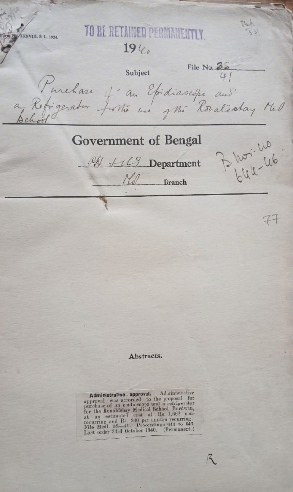 Purchase of an epidiascope and a refrigerator for the Ronald shay Medical School.