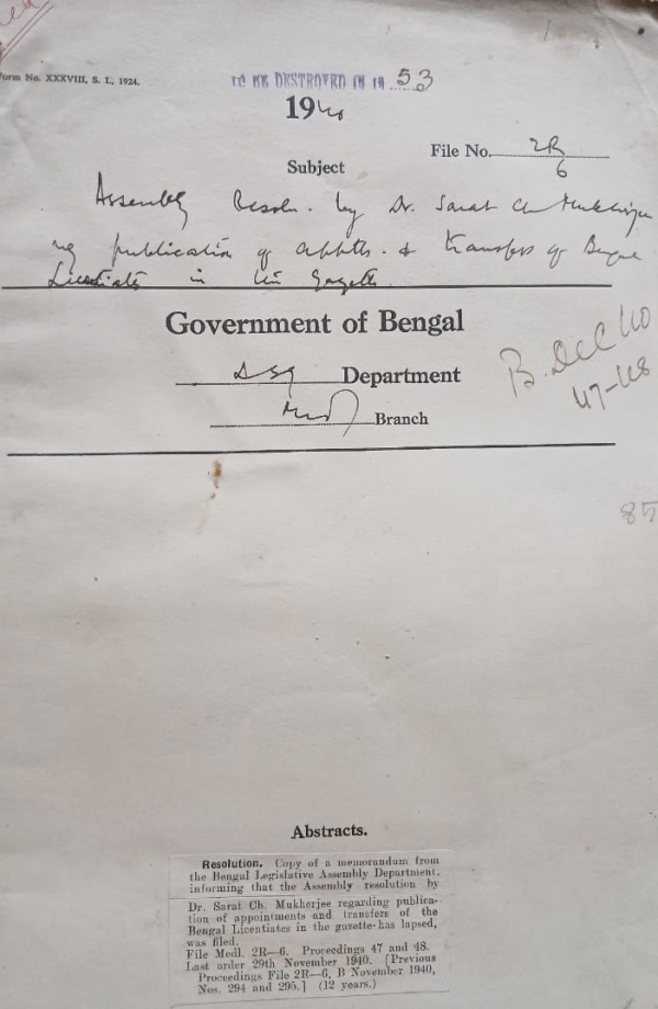 Assembly resolution by Dr. Sarat Ch. Mukherjee regarding publication of appointments and transfers of the Bengal Licentiates in the gazette.