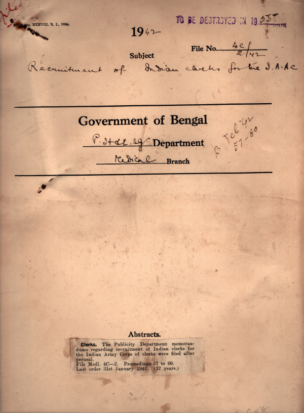 | Rack No. 09; Bundle No. 88 SL No. 6797 Admission of Mr. Kuldeep Chand Kohli in to the Medical College, Calcutta. | Rack No. 09; Bundle No. 88 SL No. 6798 Admission of Military insane in Mental Hospital. | Rack No. 09; Bundle No. 88 SL No. 6799 Appointment of a govt. Analyst under the Drugs Act, 1940. | Rack No. 09; Bundle No. 88 SL No. 6800 Recruitment of Indian Clerks for the Indian Army Corps. | Rack No. 09; Bundle No. 88 SL No. 6801 Transfer of the non-Criminal Mental Patient A. Jabber. | Rack No. 09; Bundle No. 88 SL No. 6802 Additional grant to Civil Surgeon 24 Parganas u/h "Reserve Medical Subordinates." | Rack No. 09; Bundle No. 88 SL No. 6803 Defence of India Rules. |