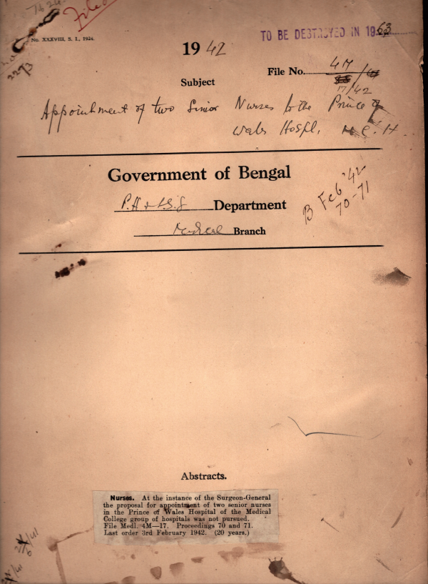 | Rack No. 09; Bundle No. 88 SL No. 6801 Transfer of the non-Criminal Mental Patient A. Jabber. | Rack No. 09; Bundle No. 88 SL No. 6802 Additional grant to Civil Surgeon 24 Parganas u/h "Reserve Medical Subordinates." | Rack No. 09; Bundle No. 88 SL No. 6803 Defence of India Rules. | Rack No. 09; Bundle No. 88 SL No. 6804 Appointment of two Senior Nurses to the Prince of Wals Hospital. | Rack No. 09; Bundle No. 88 SL No. 6805 Extension of the tenure of appointment of Dr. Janmini Bhushan Banerjee as teacher of Pathology Jackso Medical School , Jalpaiguri. | Rack No. 09; Bundle No. 88 SL No. 6806 Relaxation of S.M.F. regulations in favoure of Mvi. Nuruddin Ahmed, a student of the Dacca Medical School. | Rack No. 09; Bundle No. 88 SL No. 6807 Creation at the Police training college, Sardah of one post of S.A.S. and one post of Compounder. |