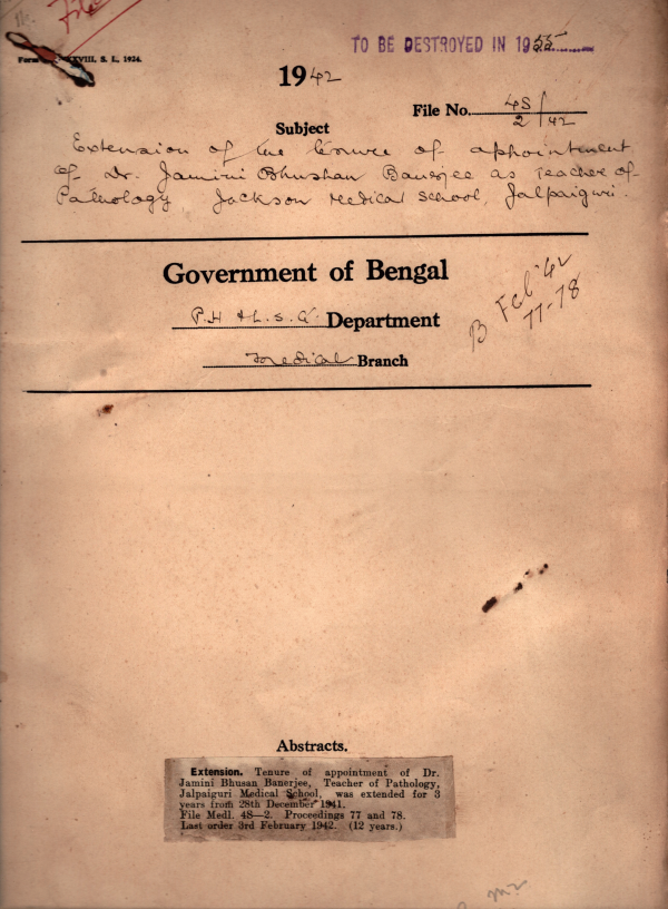 | Rack No. 09; Bundle No. 88 SL No. 6802 Additional grant to Civil Surgeon 24 Parganas u/h "Reserve Medical Subordinates." | Rack No. 09; Bundle No. 88 SL No. 6803 Defence of India Rules. | Rack No. 09; Bundle No. 88 SL No. 6804 Appointment of two Senior Nurses to the Prince of Wals Hospital. | Rack No. 09; Bundle No. 88 SL No. 6805 Extension of the tenure of appointment of Dr. Janmini Bhushan Banerjee as teacher of Pathology Jackso Medical School , Jalpaiguri. | Rack No. 09; Bundle No. 88 SL No. 6806 Relaxation of S.M.F. regulations in favoure of Mvi. Nuruddin Ahmed, a student of the Dacca Medical School. | Rack No. 09; Bundle No. 88 SL No. 6807 Creation at the Police training college, Sardah of one post of S.A.S. and one post of Compounder. | Rack No. 09; Bundle No. 88 SL No. 6808 Communal ratio statement for the B.M.S. (Lower) both permanent and temporary. |